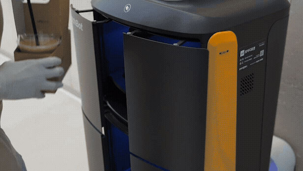 로봇이 엘리베이터를 스스로 탑승하여 층간 배송으로 식음료를 전달해요